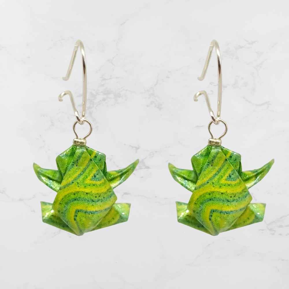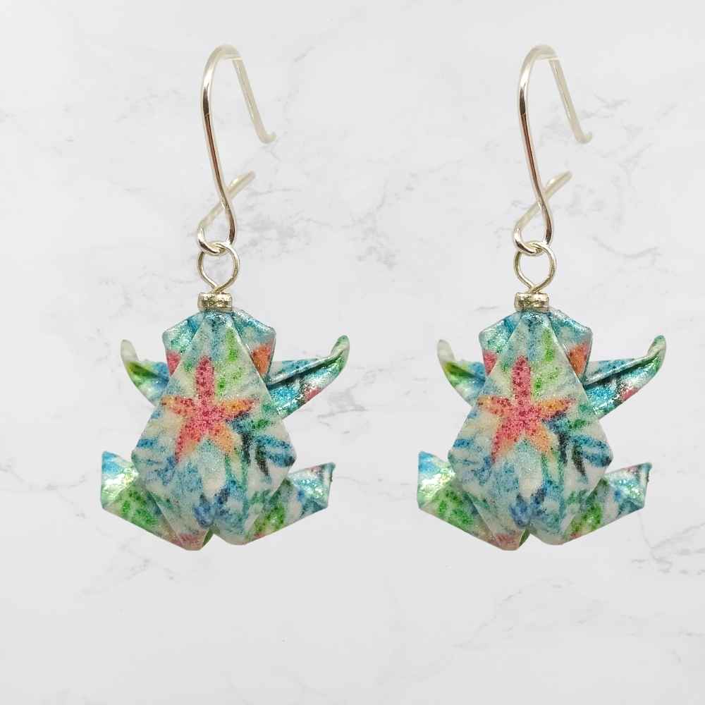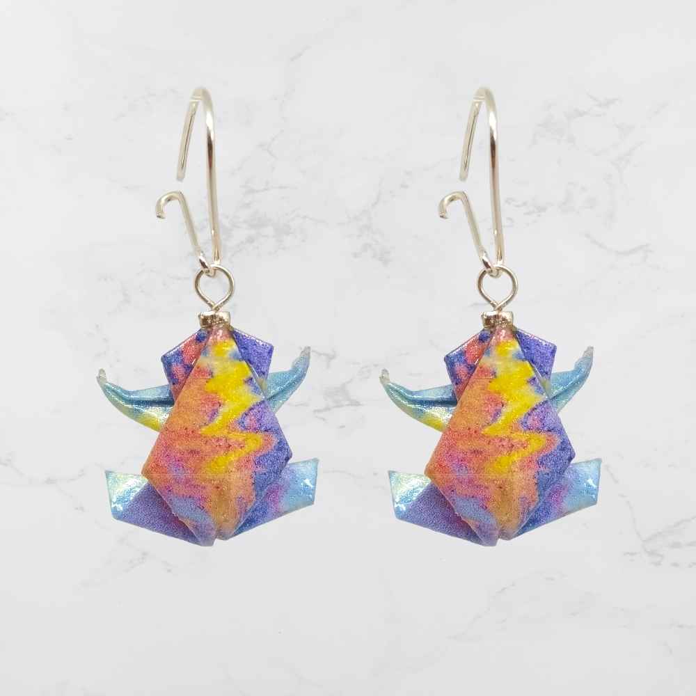 Aretes de Origami Hechos a mano cristalizados en resina para brindar protección y conservar el color durante años, Estas piezas de joyería son muy livianas y resistentes al agua, La figura esta plegada en papel de 120gr. Los broches son de seguridad fabricados en Plata Ley 925.